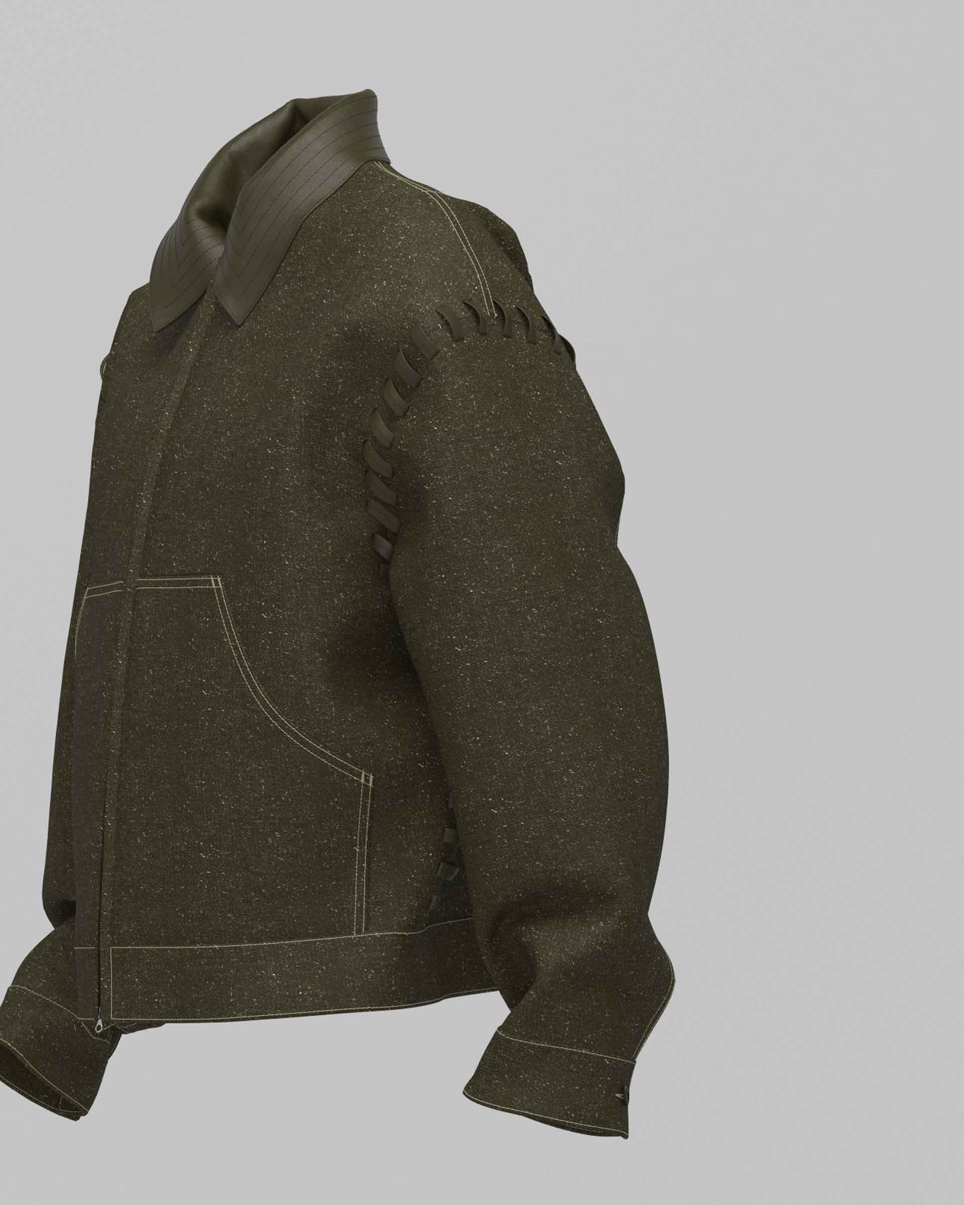 The garment is made from an exclusive fabric developed by BESTE Textile Division, produced on mechanical shuttle looms with selvage edges that highlight the authentic, constructive nature of traditional denim. The fabric features a classic 3/1 twill construction, combining ITACO cotton yarn with a thread made from recycled leather derived from industrial leather goods waste.