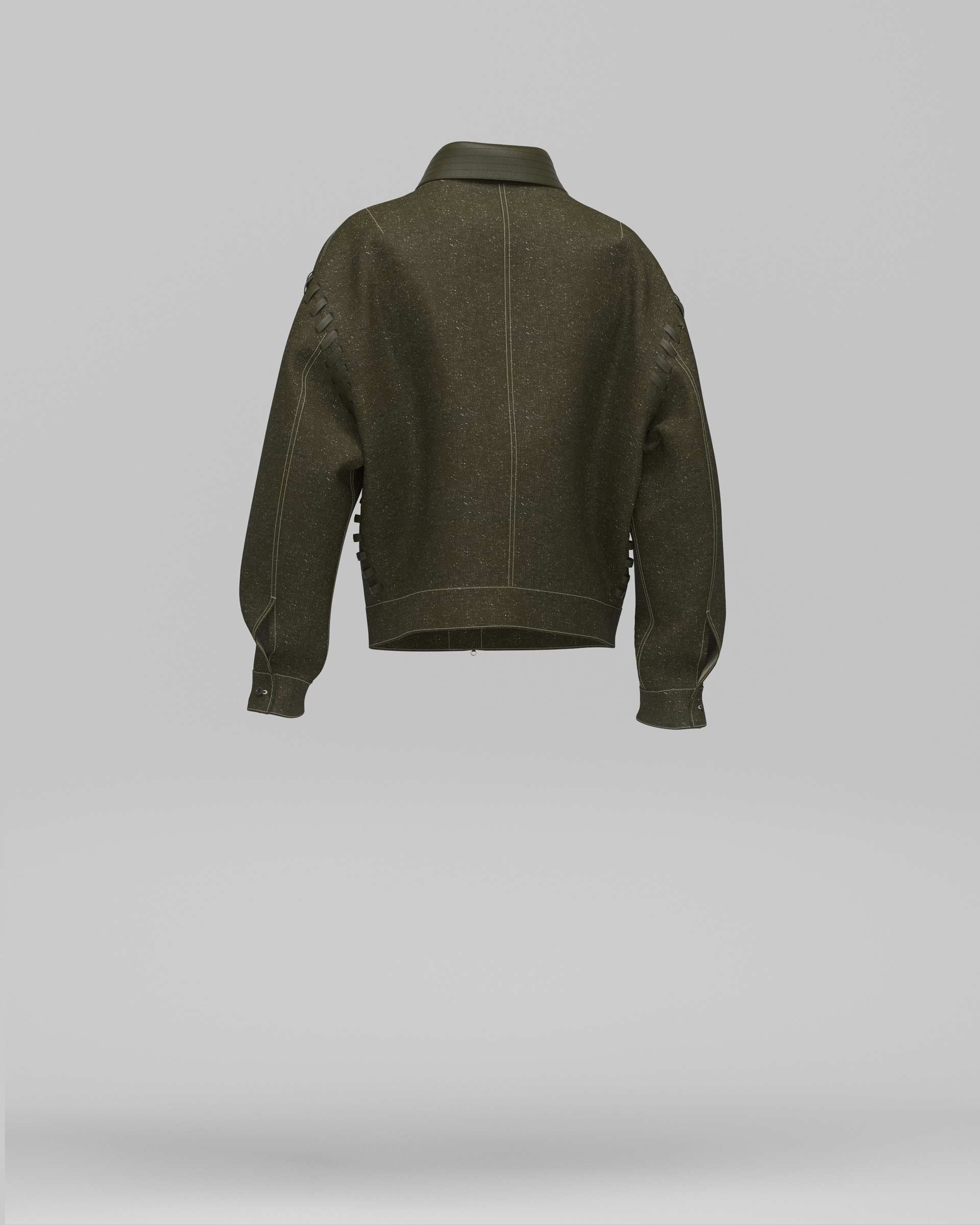 The calf leather strips, produced by GAB, are 0.9 cm wide, laminated leather-on-leather, and topstitched at the center with tone-on-tone thread, achieving a technical effect consistent with the denim aesthetic. Leather components such as the collar are produced by ALEX&Co., while the fabric panels are sent to PUNTOART for laser-cut slots designed to accommodate the leather insertions.